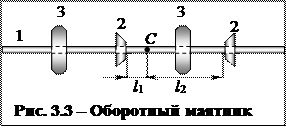 Полученное соотношение (3.16) также может быть использовано для определения ускорения свободного падения g. Для этого необходимо измерить Т, I0 и l и выразить через них g с помощью формулы (3.16). Оказывается, однако, что с высокой точностью можно измерить только период колебания Т маятника, а величины I0 и l достаточно точно измерить не удается. Для этой цели удобно использовать оборотный маятник, т.е. маятник, представляющий собой массивный стержень (1), с двух концов которого закреплены параллельные друг другу опорные призмы (ножи) (2), за которые маятник может поочередно подвешиваться. Вдоль стержня могут перемещаться и закрепляться тяжелые грузы (3) (см. рис. 3.3).