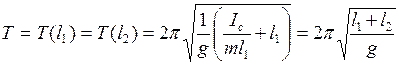Попробуем найти такие два положения l1 и l2 (l1¹l2) опорных призм по разные стороны от центра масс, чтобы периоды колебаний маятника совпадали: