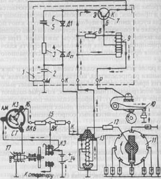 «плюс» аккумуляторной батареи 14-зажим "КЗ" тягового реле стартера 17-зажим "AM"выключателя 16 зажигания-ротор вык-лючателя-зажим "КЗ" выключателя два добавочных резистора 15, соединенных с клеммами "ВК-Б" и "ВК" - первичная обмотка катушки зажигания 13-безымянный зажим транзисторного ком-