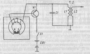 Когда крестообразный магнит датчика 1 неподвижен, транзистор закрыт и ток в первичной обмотке L, катушки зажигания Т, отсутствует. При вращении магнита в обмотке датчика индуктируется переменная э.д.с. В положительные полупериоды напряжения на датчике транзистор находится в состоянии насыщения и по обмотке L{ катушки протекает ток, а в отрицательные полупериоды транзистор вновь закрывается. Это вызывает исчезновение тока в первичной цепи и индуктирование импульсов высокого напряжения в катушке зажигания, которые распределителем подаются к свечам зажигания. На пусковой частоте вращения амплитуда импульсов датчика мала, поэтому без формирующего каскада эта система начинает работать лишь при средних частотах вращения. В реальных системах зажигания применяются дополнительные каскады усиления, позволяющие снизить начальную частоту вращения ротора датчика импульсов, при которой осуществляется зажигание.