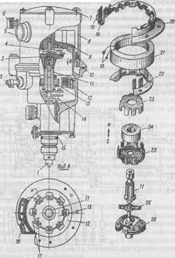 1-валик; 2-штуцер; 3-ротор; 4-контактный уголек; 5-патрубок экрана; 6-муф-та; 7-крышка экрана; 8-экран; 9-крышка распределителя; 10-прокладка; 11-втулка; 12-статор; 13-ротор; 14-грузики; 15-прокладка; 16-пластина; 17-ус-тановочные метки; 18-выводы обмотки статора; 19-пласмассовая колодка; 20 и 22-магнитопроводы; 21-обмотка статора; 23-магнитопровод; 24-постоянный магнит; 25-поводковая пластина; 26-палец
