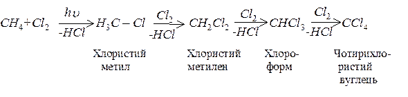 При хлоруванні атоми гідрогену алканів поступово замінюються на хлор з утворенням різноманітних хлорпохідних алканів: