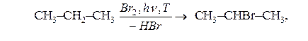 б) бромування алканів відбувається при більш жорстких умовах, бром заміщує гідроген переважно у середині молекули: