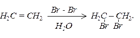 Реакція з бромом проходить з обезбарвленням розчину бромної води і є якісною реакцією на подвійний зв’язок: