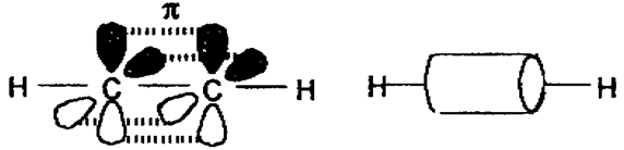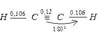 Молекула ацетилену є лінійною, всі чотири атоми розміщені на одній прямій. Обидві sp – гібридизовані орбіталі атома вуглецю скеровані під кутом 1800. p – електронна густина потрійного зв’язку має циліндричну симетрію відносно лінії сполучення ядер чотирьох атомів. На відміну від подвійного зв’язку, p – електронна густина потрійного зв’язку важче піддається поляризації, оскільки довжина потрійного зв’язку менша, ніж довжина подвійного зв’язку: