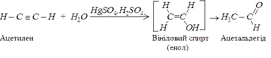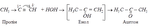 а) реакція Кучерова (гідратація). Приєднання води ацетиленових сполук теж відбувається в дві стадії. Спочатку утворюється нестійкий енол, який відразу ж ізомерізується в карбонільну сполуку: