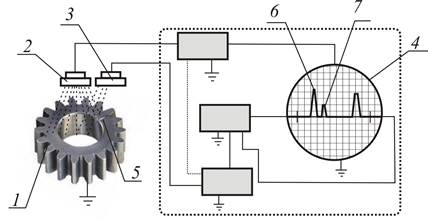 Рис. 17.4. Схема дефектоскопии «звуковое эхо» (принцип отраженных ультразвуковых волн): 1- контролируемая деталь, 2 - приемный щуп, 3 - пьезоизлучатель, 4 - электроннолучевая трубка, 5 - дефект, 6 - начальный импульс, 7 - импульс, отраженный от дефекта