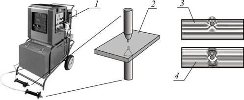 Рис. 17.5. Процесс магнитной дефектоскопии: 1- магнитный дефектоскоп; 2 - контролируемая деталь; 3,4 - магнитные поля дефектов
