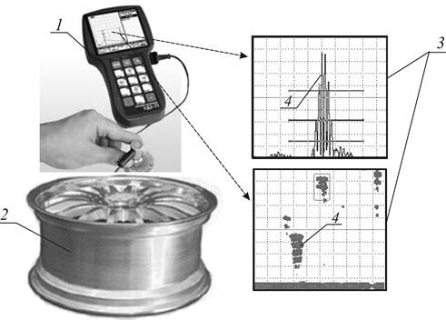 Рис. 17.7. Типовая схема дефектоскопии электромагнитным методом: 1- прибор, 2 - деталь, 3 - показания экрана прибора, 4 - дефект