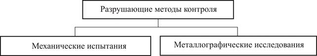 К разрушающим методам контроля относятся способы испытания контрольных образцов с целью получения необходимых характеристик контролируемого объекта. Эти методы могут применяться как на контрольных образцах, так и на отрезках, вырезанных из самого объекта. В результате разрушающих методов контроля проверяют правильность подобранных материалов, выбранных режимов и технологий. Общая классификация методов разрушающего контроля показана на рисунке 17.8.