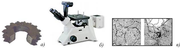 Рис. 17.10. Микроструктурный анализ причин и разрушения фрезы: разрушенная фреза (а); микроскоп (б); видимые дефекты металла, приведшие к разрушению