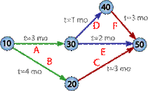 Пример сетевой диаграммы PERT для проекта продолжительностью в семь месяцев с пятью промежуточными точками (от 10 до 50) и шестью деятельностями (от A до F).