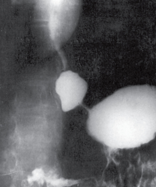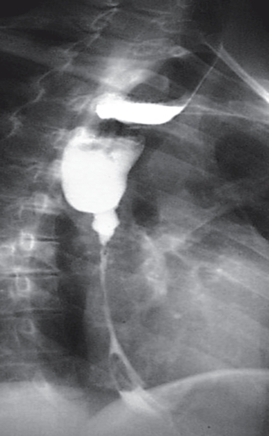 Больная, 29 лет, жалуется на выраженную дисфагию (проходит только вода), общую слабость, похудение, повышенную саливацию. Год назад с суицидальной целью выпила уксусную эссенцию. Первая помощь была оказана дома, затем в стационаре. Из больницы выписана через 1 мес в удовлетворительном состоянии, пища по пищеводу проходила свободно. Через 3 мес после выписки возникла дисфагия, которая прогрессирующе усиливается. Больная похудела на 11 кг. Рентгенологически выявлена следующая картина (рис. 27).