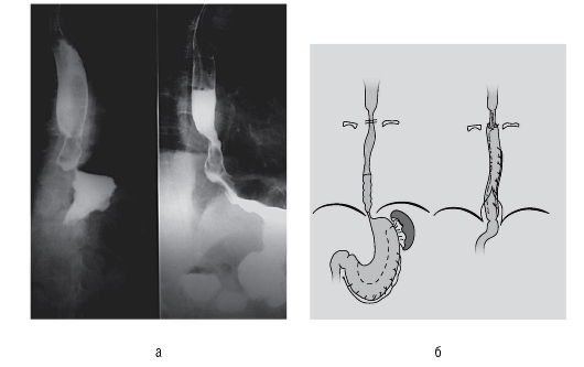 наличие подслизистой опухоли пищевода (рис. 30, б). Биопсия противопоказана из-за возможного повреждения слизистой оболочки, что в дальнейшем осложнит оперативное лечение и увеличит продолжительность госпитального периода.