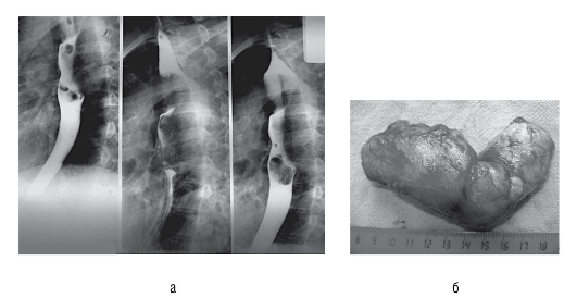 Рис. 30 (см. также цв. вклейку).Рентгенограмма пищевода (а) и удаленное новообразование (б) у больного, 52 лет