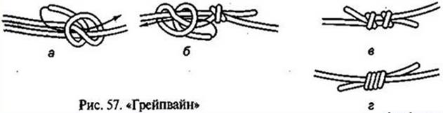 Узел грейпвайн наиболее надежен для связывания веревок одинакового диаметра, лент, вязки петель-оттяжек, петель для закладок (рис. 224). Особенно удобен этот узел при связывании петли для самостраховки, этим же узлом можно регулировать длину петли.