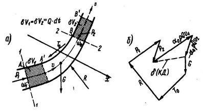Из сказанного ясно, что векторы всех внешних сил, действующих на рассматриваемый отсек жидкости (см. силы G, Т0, R, Р1, и Р2 на рис. 3.6, а), вместе с векторами секундного количества движения