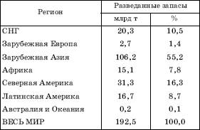 Уголь широко распространен в земной коре: известно более 3,6 тыс. его бассейнов и месторождений, которые в совокупности занимают 15 % земной суши. Как общие, так и разведанные запасы угля намного больше запасов нефти и природного газа. В 1984 г. на XXVII сессии Международного геологического конгресса общие мировые угольные ресурсы были оценены в 14,8 трлн т (в том числе 9,4 трлн т каменного и 5,4 трлн т бурого угля), а во второй половине 1990-х гг. в результате разного рода переоценок и перерасчетов – в 5,5 трлн т (в том числе 4,3 трлн т каменного и 1,2 трлн т бурого угля).