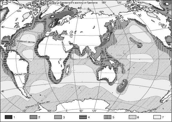Рис. 29. Рыбопродуктивность Мирового океана (по П. П. Моисееву): 1 – более 3000 кг/км2; 2 – более 1000; 3 – более 500; 4 – более 200; 5 – более 100; 6 – более 10; 7 – более 7 кг/км2