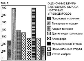 Рассмотрим теперь более подробно нефтяное загрязнение Мирового океана как наиболее распространенное и опасное. Встречающиеся в литературе оценки общего количества нефти и нефтепродуктов, ежегодно попадающих в акватории Мирового океана, различаются очень сильно: от 3–5 млн т до 10–15 млн и даже 25–30 млн т. Видимо, наиболее достоверным надо считать показатель в пределах от 3 до 8 млн т в год.