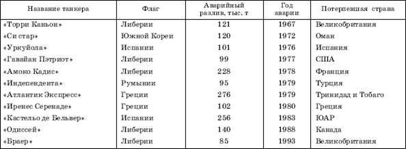 Аварии танкеров могут быть вызваны техническими причинами – различного рода поломками, возникновением пожаров. Иногда на танкерах происходят взрывы («Кастельо де Бельвер» на рейде Кейптауна). Но еще чаще танкеры попадают на рифы и камни («Амоко Кадис» в Бискайском заливе). А у южной оконечности Африки, где супертанкеры из Персидского залива, меняя курс, берут направление на Европу или США, причиной катастроф могут оказаться волны-«убийцы», высота которых достигает 20 м. Они просто разламывают корпус судна.