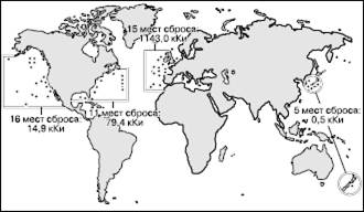На рисунке 34 показаны главные районы захоронения твердых радиоактивных отходов в зарубежных странах. США захоранивают такие отходы в Тихом, Атлантическом океанах и Мексиканском заливе, европейские страны – в прилегающей части Атлантики и Средиземном море, Япония – в прилегающих акваториях. К этому нужно добавить также жидкие радиоактивные отходы с плутониевых заводов, которые в США попадают прежде всего в район устья р. Колумбия, а в Великобритании – в Ирландское море.
