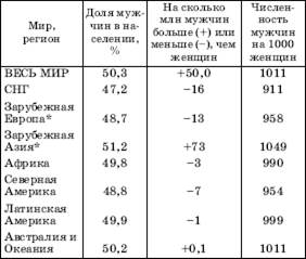 Из приведенных в таблице 43 данных со всей очевидностью следует, что в СНГ, зарубежной Европе и Северной Америке преобладают женщины, в зарубежной Азии – мужчины, а в Африке, Латинской Америке, Австралии и Океании сохраняется соотношение между полами примерно на уровне «фифти-фифти». В каждом отдельном случае подобные различия вполне объяснимы.