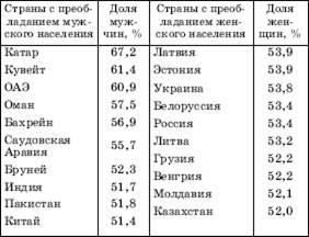 Большинство стран с преобладанием мужчин составляют нефтедобывающие страны Персидского залива и Бруней, отличающиеся прямо-таки экстремально большой долей мужского населения. Об этом же свидетельствуют показатели численности мужчин, приходящихся на 100 женщин, которые в Катаре, Кувейте и ОАЭ превышают 170 человек! Такая удивительная диспропорция полов объясняется массовой иммиграцией в эти страны рабочей силы, преимущественно мужской. Но, разумеется, в абсолютных показателях перевес мужчин особенно велик в странах-гигантах Китае и Индии, где на 100 женщин приходится 106 мужчин. В конце 1990-х гг. перевес мужчин над женщинами в Китае достигал 23 млн, в Индии – 36 млн, в Пакистане – 4,2 млн человек.