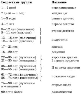 Собственно говоря, подобная классификация и служит основой для выделения и исчисления людских контингентов, относящихся к дошкольному, школьному, брачному, призывному, избирательному, военнообязанному, репродуктивному (во всем мире женщин этого возраста более 1,5 млрд), трудоспособному, пенсионному и другим возрастам. Особое значение среди этих категорий имеет подразделение людей на три группы: дотрудоспособного (дорабочего), трудоспособного (рабочего) и послетрудоспособного (послерабочего) возрастов. Границы между ними могут быть проведены по-разному. Так, в России к категории лиц трудоспособного возраста относят мужчин в возрасте от 16 до 59 лет и женщин в возрасте от 16 до 54 лет (включительно), а в большинстве зарубежных стран трудоспособными считают мужчин и женщин в возрасте от 16 до 65 лет.