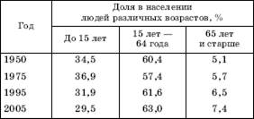 Соответственно этому для характеристики возрастной структуры населения и оценки структурных сдвигов в отечественной демографии применяется укрупненное подразделение всех людей на три возрастные группы: детскую (0—14 лет), взрослую (15–59 лет) и пожилую (60 лет и старше). В международной демографической статистике обычно применяется градация 0—14, 15–64, 65 лет и старше. Понятно, что по мере изменения режима воспроизводства населения меняется и долевое соотношение трех указанных групп возрастов. Это можно продемонстрировать на примере данных обо всем мире, которые отражают процесс постепенного старения населения (табл. 45).