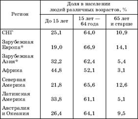 При всех различиях в показателях крупных регионов мира можно выделить два типа возрастной структуры населения, соответствующие двум типам его воспроизводства. Первый тип, характерный для зарубежной Азии, Африки и Латинской Америки (с типичными для них высокими показателями рождаемости и смертности и пониженной средней продолжительностью жизни), отличается очень большой долей в населении детей и незначительной долей пожилых людей. Второй тип характерен для стран с невысокой рождаемостью, низкой смертностью и большой средней продолжительностью жизни – прежде всего для стран зарубежной Европы и Северной Америки, но в известной мере также для СНГ, Австралии и Океании. Самые характерные черты этого типа возрастной структуры населения – меньшая доля детей и высокий процент пожилых людей.