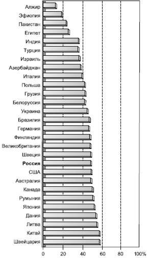 Рис. 42. Доля экономически активного населения в общей численности населения некоторых стран (в середине 1990-х гг.)