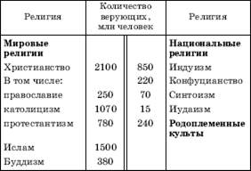 Что же касается количественных оценок численности верующих по отдельным конфессиям, то из-за отсутствия достоверной статистики в разных источниках они различаются весьма сильно. Разуеется, нужно учитывать и то, что количество верующих со временем может меняться. Согласно новым и вполне достоверным источникам, в наши дни распределение верующих по отдельным религиям выглядит следующим образом. (табл. 58).