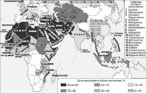 Ислам – вторая по численности верующих мировая религия – также широко распространен в мире, но, в отличие от христианства, это распространение ограничивается преимущественно пределами Азии и Африки. Главные районы ислама – Юго-Западная и Центральная Азия, Северная Африка, а отчасти и Юго-Восточная Азия. В Юго-Западной Азии ислам преобладает во всех странах, за исключением Кипра и Израиля, в Южной Азии – в Пакистане и Бангладеш, в Юго-Восточной – в Индонезии, в Центральной – в Таджикистане, Туркмении, Узбекистане, Киргизии, Казахстане. В Северной Африке ислам господствует во всех без исключения странах, а в Центрально-Восточной Африке – выборочно. В зарубежной Европе мусульман больше всего в Албании, Боснии и Герцеговине, Македонии, Сербия (рис. 44).