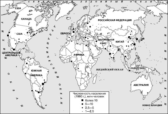 Рис. 49. Размещение городских агломераций-«миллионеров» мира, 1990 г. (по Ю. Л. Пивоварову)