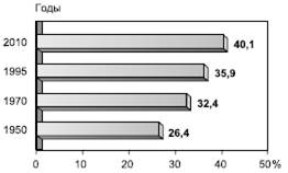 Рис. 50. Рост доли городов-«миллионеров» в численности городского населения мира (по Ю.Л.Пивоварову)