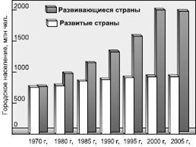 Рис. 51. Рост городского населения в экономически развитых и развивающихся странах в 1970–2005 гг.