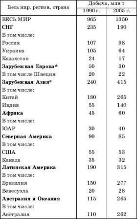 Ориентация на каменноугольные бассейны, как уже отмечалось, была главной на протяжении всего XIX и первой половины XX в. Это объясняется как достаточно широким распространением таких бассейнов, так и тем, что на выплавку 1 т чугуна расходовалось больше угля, чем железной руды. Классические примеры такого типа ориентации демонстрирует размещение металлургии России, Украины, США, многих стран зарубежной Европы и Азии. При этом для ряда из них типично формирование не отдельных металлургических центров, а металлургических районов. В наши дни в мире в целом в пределах угольных бассейнов производится примерно 1/3 черных металлов, а в зарубежной Европе– 1/2. Добавим, что мировая потребность в коксе ныне составляет примерно 350 млн т, и для его получения ежегодно расходуется 500 млн т коксующегося угля. По производству металлургического кокса лидируют зарубежная Европа, страны СНГ, США, Япония и Китай.
