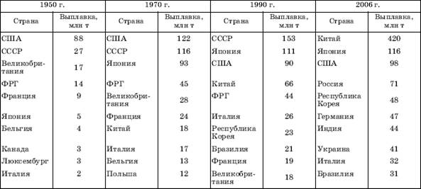 Анализ таблицы 106 показывает, что еще в 1950 г. в первую десятку стран по выплавке стали входили страны Европы, СССР, США, Япония и Канада, в 1970 г. в нее вошел Китай, в 1990 г. – Республика Корея и Бразилия, а в 2003 г. добавилась еще и Индия. Зато в 2006 г. в ее составе уже не осталось Великобритании, Франции, Бельгии, Польши. Интересно проследить и изменение состава первой тройки стран-лидеров. В 1950 г. это были США, СССР и Великобритания, в 1970 г. – США, СССР и Япония, в 1990 г. – СССР, Япония и США, а в 2006 г. – Китай, Япония и США. Можно добавить также, что, поскольку ныне в мире (в тех или иных размерах) выплавку стали производят уже более чем в 90 странах, в целом доля лидирующей десятки стран постепенно уменьшается.