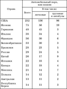 Данные таблицы 145 очень наглядно отражают некоторые закономерности современного мирового хозяйства. Первые шесть мест по величине автомобильного парка занимают великие державы западного мира. Среди стран-лидеров по этому показателю фигурируют три ключевые развивающиеся страны – Китай, Бразилия и Мексика, а также Россия, Канада, Австралия и три менее крупные страны – Испания, Польша и Республика Корея. Кстати, при оценке роли США как страны, которая возглавляет список лидеров, нужно все же иметь в виду, что ныне ее доля в мировом автопарке составляет мнее 1/3, тогда как на рубеже 50—60-х гг. XX в. она достигала 2/3.