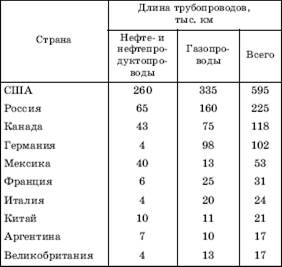 В составе первой десятки стран по протяженности газопроводов первые семь позиций – с огромным количественным перевесом – занимают экономически развитые страны. Это во многом объясняется тем, что строительство газопроводов в Китае началось сравнительно недавно, большинство же развивающихся стран если и экспортирует природный газ, то в сжиженном виде морским путем. В свою очередь, из перечисленных в таблице развитых стран США, Германия, Франция, Италия (к ним можно добавить Украину, Белоруссию, Польшу, Чехию, Австрию и др.) имеют ярко выраженную потребительско-импортную ориентацию, а Россия и Канада (к ним можно добавить Туркмению, Норвегию, Алжир) – потребительско-экспортную или экспортно-потребительскую ориентацию. Самые большие по протяженности газопроводы действуют в странах СНГ, Канаде и США.