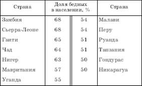 В следующую группу стран, где доля бедных в населении составляет от 40 до 50 %, входят (по убывающей) Лесото, Сальвадор, Лаос, Бангладеш, Нигерия, Непал, Кения, Индия, Шри-Ланка, Филиппины и Камерун. Если совместить эти данные с данными таблицы, то нетрудно подсчитать, что из перечисленных 25 стран к Африке относятся 13, к Азии – 6 и к Латинской Америке – 5. Но в составе первой десятки, как легко можно заметить, явно преобладают страны Африки. Судя по прогнозу, сделанному на Всемирной конференции в Рио-де-Жанейро в 1992 г., в первой четверти XXI в. в Африке произойдет значительное увеличение числа бедных людей.