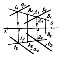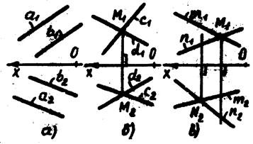 (рис. 4.3,а). Если прямые пересекаются, то точки пересечения одноименных проекций должны располагаться на прямой, перпендикулярной к оси Ох:
