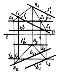Прямая, принадлежащая плоскости и параллельная фронтальной плоскости проекций, называется фронталью этой плоскости. В плоскости можно провести множество фронталей, одноименные проекции которых будут параллельными между собой.
