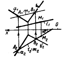 моделируется проекциями пересекающихся в точке А прямых а и