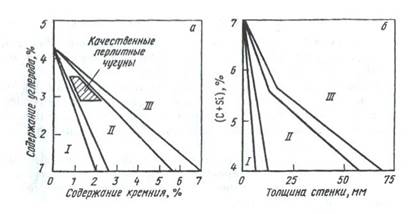 а – влияние содержания углерода и кремния на структуру чугуна при толщине стенки отливки 50 мм; б – влияние скорости охлаждения (толщины стенки отливки) и суммы С + Si на структуру чугуна; I – белые; II – серые перлитные; III – серые ферритные чугуны