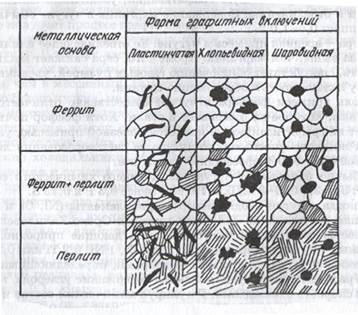 Рис. 3. Классификация чугуна по структуре металлической основы и форме графитных включений (схемы структур)