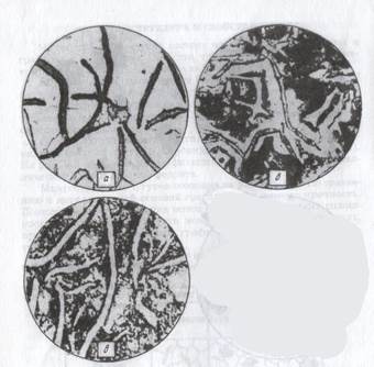 а – пластинчатый (серый чугун); б – хлопьевидный (ковкий чугун); в – шаровидный (высокопрочный чугун)