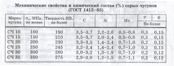 Серый чугун маркируется буквами СЧ и цифрами, характеризующими величину временного сопротивления при испытаниях на растяжение. Марки и механические свойства серых чугунов, а также их ориентировочный химический состав приведены в табл.1.