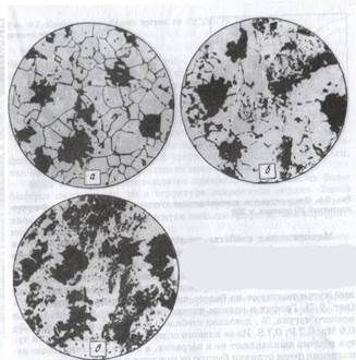 Рис. 7. Микроструктура ковких чугунов на ферритной (а); ферритно-перлитной (б) и перлитной (в) основах.